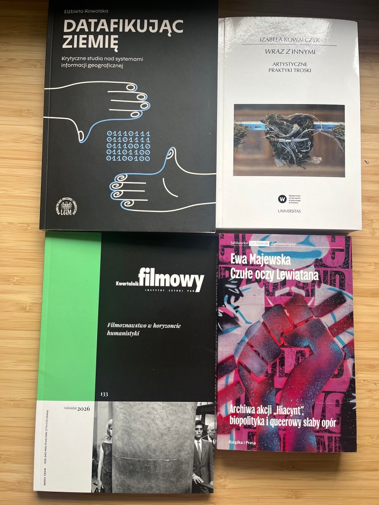 W międzyczasie dźwigałam czasem do domu torbę wyładowaną książkami. Napisanymi nie przeze mnie. Książkami, które do mnie dotarły dzięki szczodrobliwości i hojności osób autorskich (na focie tylko niewielki fragment tego ładunku) – i w których mam też czasem jakiś niewielki udział, mniej czy bardziej sformalizowany. Z Ewą Majewską i Izabelą Kowalczyk od lat łączą nas trajektorie współmyślenia, które meandrują, schodzą się i rozchodzą, ale zawsze są – prędzej czy później – generatywne. Owocują. Nie zawsze są to zależności do szybkiego wyłapania, czasem dopiero po fakcie (napisania czegoś) zdaję sobie sprawę, że znowu w gruncie rzeczy piszę o “słabym oporze” i “sile bezsilnych” – już nie tyle za Michelem De Certeau, ale za Ewą Majewską i Vaclavem Havlem. Książka Eli Kowalskiej jest całkowicie pionierska dla polskiej geografii humanistycznej i humanistyki przestrzennej, i miałam wielką przyjemność recenzować doktorat, na podstawie którego ta książka powstała (a fragment recenzji zawędrował na okładkę). Tego spotkania nie byłoby, gdyby nie HAT Center i Agnieszka Jelewska (promotorka doktoratu) oraz Michał Krawczak, którzy właśnie wydali dwie znakomite książki: Nuclear Gaia. Media Archives of Planetary Harm (Intellect 2025) oraz Exposing Violence. Media Practices and Aesthetics of Radical Truth (MIT Press 2026, w dodatku w otwartym dostępie). Nasze rozmowy przy niejednym stole w kilku miejscach świata zyskały nową odsłonę (niektóre z nich mają bardziej namacalny wymiar, jak zbiór Postcollectivity. Situated Knowledge and Practice (Brill 2024). To tylko mały wycinek z gęstej tkanki, którą tkam jako akademiczka, osoba myśląca i żyjąca tu i teraz.